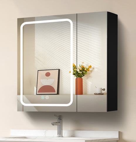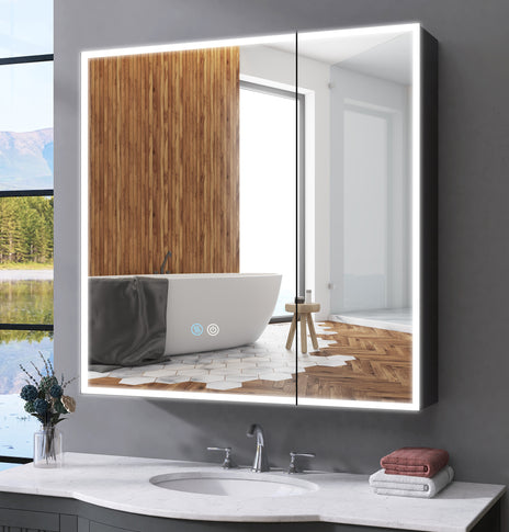 GETPRO 30x30 inch Lighted Medicine Cabinets LED Medicine Cabinet Mirror for Bathroom Black Aluminum Surface Mount Anti-fogger Function 3 Color Temperature Adjustable Brightness